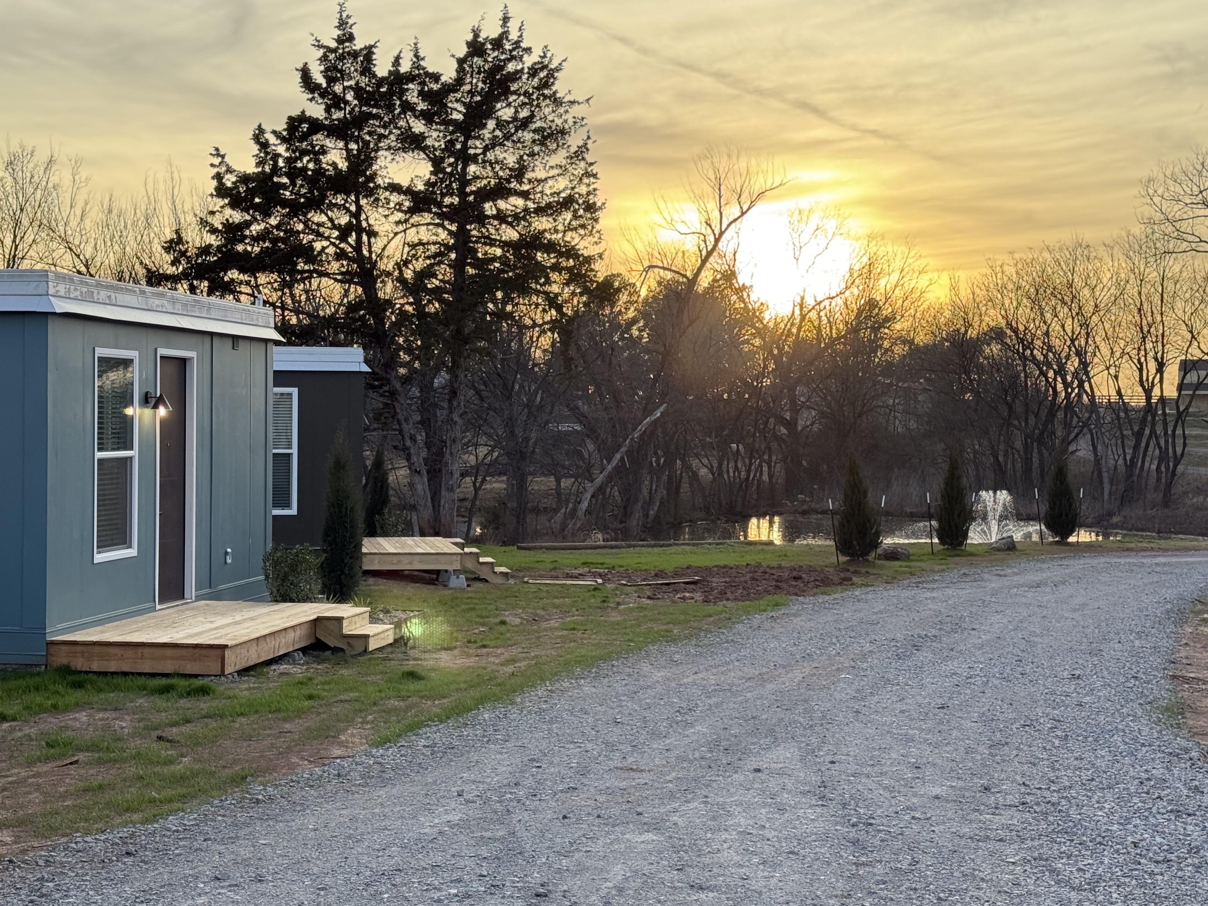 Pasadera sits on 5 acres just south of Stillwater on Perkins Rd — close enough to be at Oklahoma State University in 5 minutes, far enough that you'll actually hear the cicadas at night. The grounds include our 12-casita community and the Pasadera Event Center, a wedding and private-event venue next door. The area around the property is quiet with open Oklahoma sky — good for evening walks and morning coffee outside. Downtown Stillwater, The Strip, and Eskimo Joe's are 10 minutes north; Boone Pickens Stadium and Gallagher-Iba Arena are 5 minutes away.